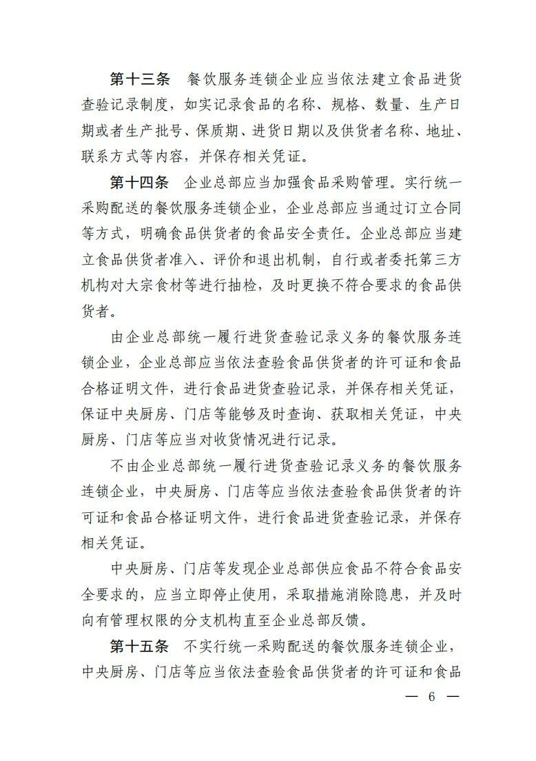 在责任分担机制方面,《规定》要求,餐饮服务连锁企业实行贯通式管理,建立总部每月调度、分支机构每周排查、门店每日管控的工作制度和机制。同时,强调抓住“关键少数”,夯实企业总部管理责任,对企业总部“管什么”“怎么管”予以明确,细化企业总部在考核评价、人员培训、“互联网+明厨亮灶”、标准化管理、食品采购、食品安全投诉处置等方面的责任义务。