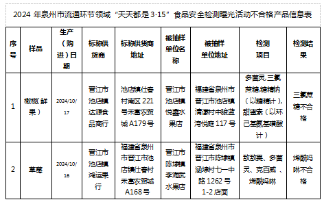 全市各县(市、区)以商超、农贸市场、水果批发市场等为重点场所,监督抽检和日常巡查相结合,重点检测销售的橄榄、草莓是否存在烯酰吗啉、多菌灵等农药残留超标,是否非法添加三氯蔗糖(甜味剂);检查市场开办者、经营者是否履行入场(进货)查验义务等。此次专项中,全市抽检橄榄、草莓共计66批次,发现不合格橄榄、草莓各1批次(详见下表)。晋江市场监管部门已责令经营者下架销毁不合格产品,并及时向社会公示不合格产品信息。