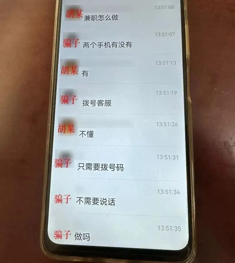 用一部手机与冒充的各种“客服”联系,用另一部手机拨打受害人电话,如此“简单的”操作让胡某选择铤而走险,“一开始我也挺害怕的,觉得做这份兼职有风险,但是收入蛮高的,我做了十几天就差不多拿了3000块,也就没想那么多了……”